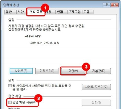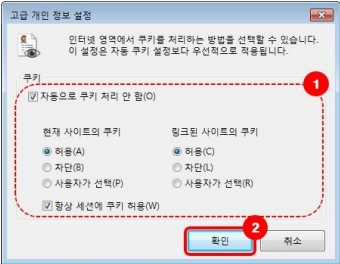 5. 고급 개인 정보 설정에서 아래 이미지와 같이 설정하고 확인을 클릭