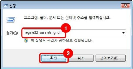 2. regsvr32 wmnetmgr.dll을 입력 후 확인을 클릭